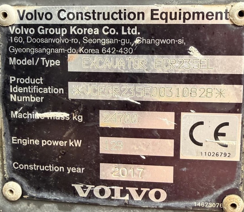 Se vende excavadora de cadenas VOLVO ECR235 EL del año 2017 con 8.809 horas de trabajo | Potencia motor: 129 kW | Peso: 24.700 kg | Ancho de la máquina: 3 m | Incluye cazo de limpieza | Para más información no dude en contactar con nosotros